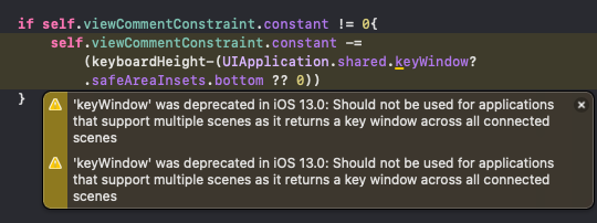 [UIKit] "keyWindow' was deprecated in iOS 13.0 : Should not be used for applications that support multiple scenes as it returns a key window across all connected scenes" error 에러 해결