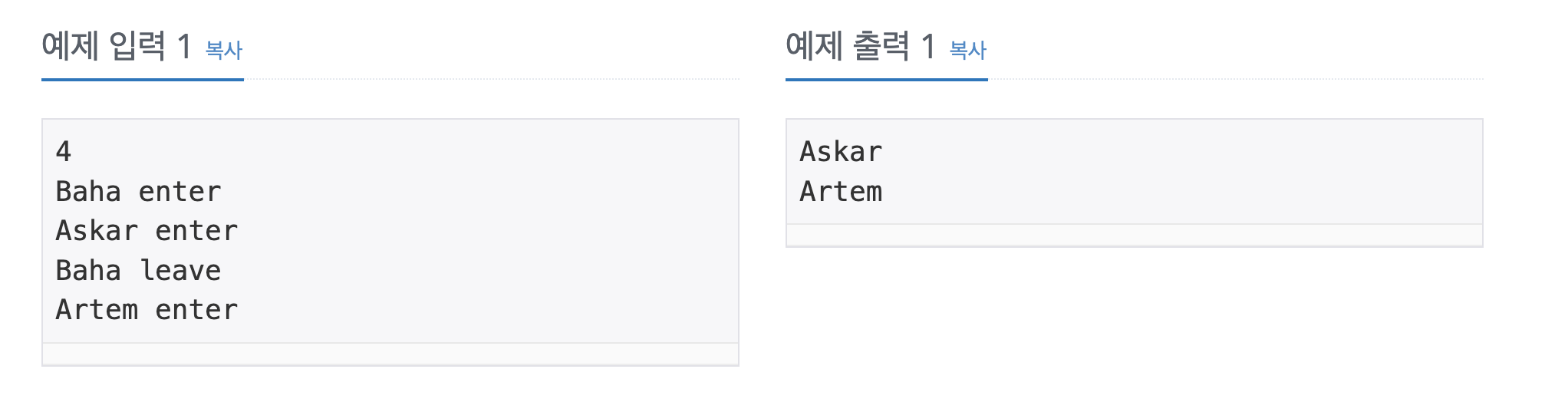 첫째 줄에 로그에 기록된 출입 기록의 수 n이 주어진다. (2 ≤ n ≤ 106) 다음 n개의 줄에는 출입 기록이 순서대로 주어지며, 각 사람의 이름이 주어지고 "enter"나 "leave"가 주어진다. "enter"인 경우는