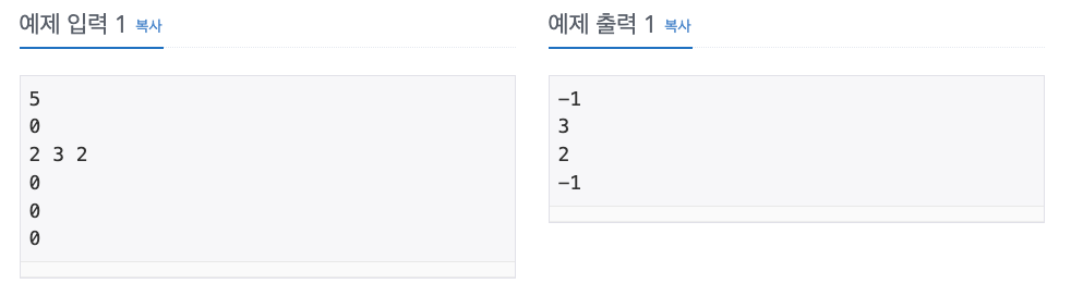 이제 산타가 선물을 나눠줄 것이다. 차례대로 방문한 아이들과 거점지의 정보들이 주어졌을 때, 아이들이 준 선물들의 가치들을 출력하시오. 만약 아이들에게 줄 선물이 없다면 -1을 출력하시오.