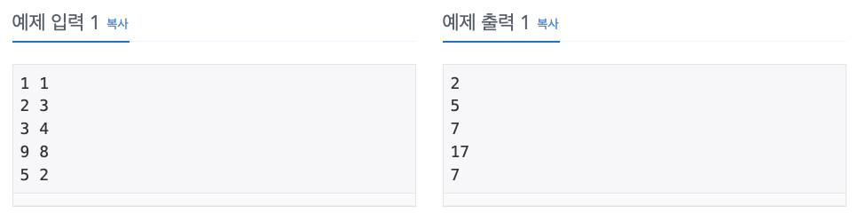 각 테스트 케이스는 한 줄로 이루어져 있으며, 각 줄에 A와 B가 주어진다. (0 < A, B < 10)