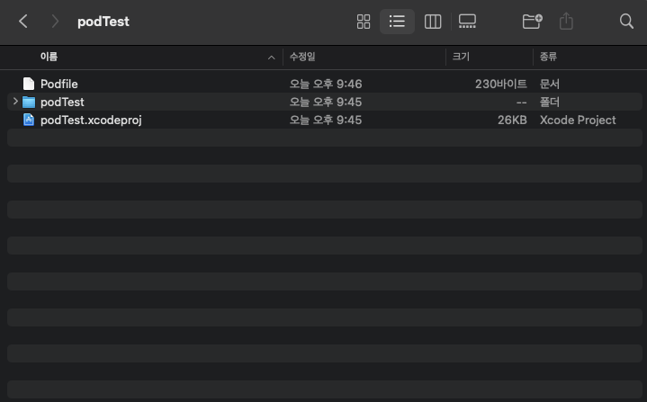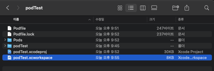 - 설치가 완료되면 폴더에 pod관련 파일들이 설치됐을 것이다.