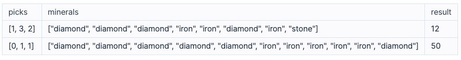 print(solution([1, 3, 2] , ["diamond", "diamond", "diamond", "iron", "iron", "diamond", "iron", "stone"] ))